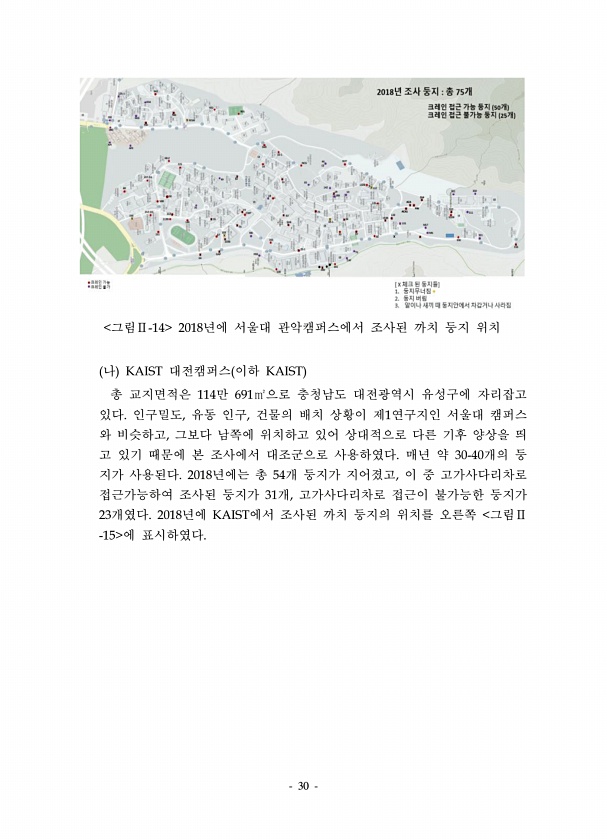 30 그림Ⅱ-14 2018년에 서울대 관악캠퍼스에서 조사된 까치 둥지 위치 나 KAIST 대전캠퍼스 이하 KAIST 총 교지면적은 114만 691㎡으로 충청남도 대전광역시 유성구에 자리잡고 있다. 인구밀도, 유동 인구, 건물의 배치 상황이 제1연구지인 서울대 캠퍼스 와 비슷하고, 그보다 남쪽에 위치하고 있어 상대적으로 다른 기후 양상을 띄 고 있기 때문에 본 조사에서 대조군으로 사용하였다. 매년 약 30-40개의 둥 지가 사용된다. 2018년에는 총 54개 둥지가 지어졌고, 이 중 고가사다리차로 접근가능하여 조사된 둥지가 31개, 고가사다리차로 접근이 불가능한 둥지가 23개였다. 2018년에 KAIST에서 조사된 까치 둥지의 위치를 오른쪽 그림Ⅱ -15 에표시하였다.