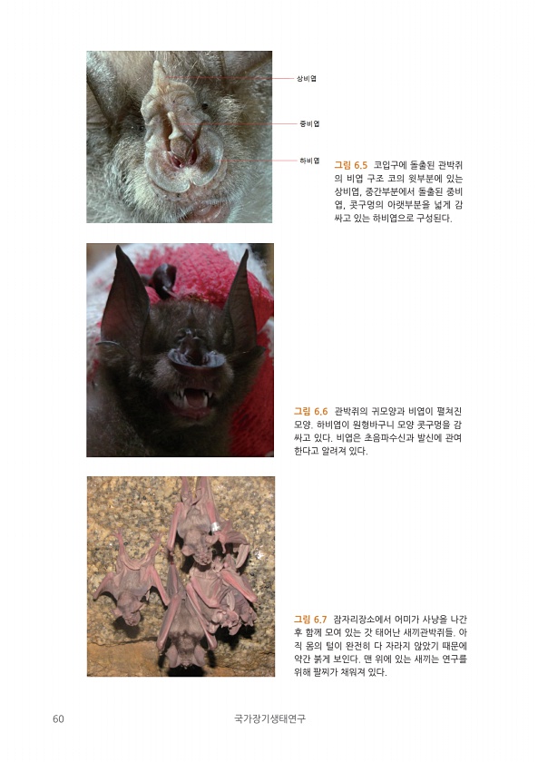 60 국가장기생태연구 그림 6.5 코입구에 돌출된 관박쥐 의 비엽 구조 코의 윗부분에 있는 상비엽, 중간부분에서 돌출된 중비 엽, 콧구멍의 아랫부분을 넓게 감 싸고 있는 하비엽으로 구성된다. 그림 6.6 관박쥐의 귀모양과 비엽이 펼쳐진 모양. 하비엽이 원형바구니 모양 콧구멍을 감 싸고 있다. 비엽은 초음파수신과 발신에 관여 한다고 알려져 있다. 그림 6.7 잠자리장소에서 어미가 사냥을 나간 후 함께 모여 있는 갓 태어난 새끼관박쥐들. 아 직 몸의 털이 완전히 다 자라지 않았기 때문에 약간 붉게 보인다. 맨 위에 있는 새끼는 연구를 위해 팔찌가 채워져있다.