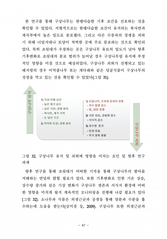 47 본 연구를 통해 구상나무는 한랭다습한 기후 조건을 선호하는 것을 확인할 수 있었다 지형적으로는 한랭다습한 조건이 유지되는 북사면과 계곡부에서 높은 밀도로 분포했다 그리고 다른 수종과의 경쟁을 피하 기 위해 너덜지대나 토양이 척박한 곳에 주로 분포하는 것으로 확인되 었다 특히 조릿대가 우점하는 곳은 구상나무 유묘의 밀도가 낮아 향후 기후변화로 조릿대의 분포 범위가 늘어날 경우 구상나무림 유지에 부정 적인 영향을 미칠 것으로 예상되었다 구상나무 쇠퇴가 진행되고 있는 돼지령의 경우 미역줄나무 또는 개다래와 같은 덩굴식물이 구상나무의 성장을 막고 있는 것을 확인할 수 있었다 그림 그림 구상나무 유지 및 쇠퇴에 영향을 미치는 요인 및 향후 연구 과제 향후 연구를 통해 조릿대가 어떠한 기작을 통해 구상나무의 발아...