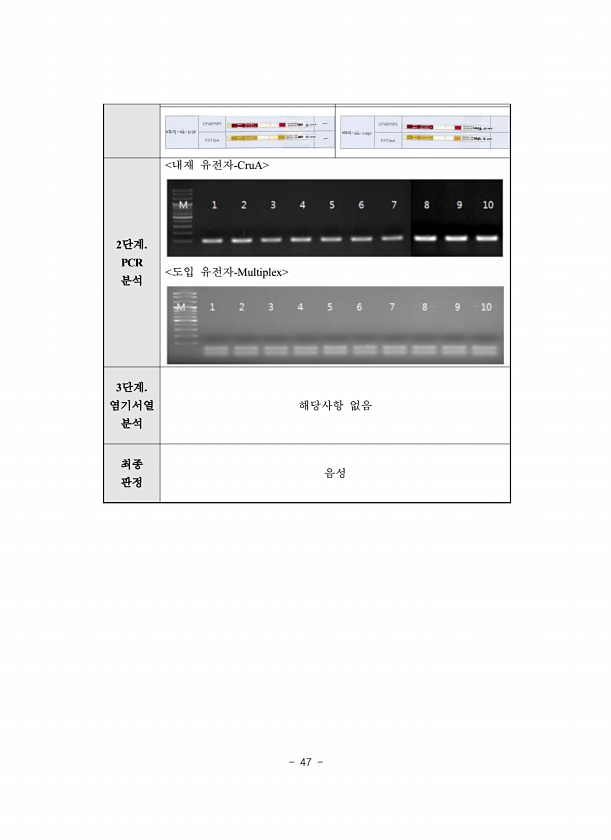 47 2단계. PCR 분석 내재 유전자-CruA 도입 유전자-Multiplex 3단계. 염기서열 분석 해당사항 없음 최종 판정음성