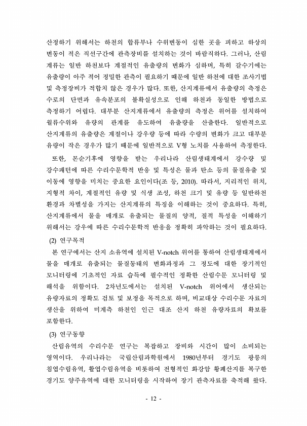 12 산정하기 위해서는 하천의 합류부나 수위변동이 심한 곳을 피하고 하상의 변동이 적은 직선구간에 관측장비를 설치하는 것이 바람직하다. 그러나, 산림 계류는 일반 하천보다 계절적인 유출량의 변화가 심하며, 특히 갈수기에는 유출량이 아주 적어 정밀한 관측이 필요하기 때문에 일반 하천에 대한 조사기법 및 측정장비가 적합치 않은 경우가 많다. 또한, 산지계류에서 유출량의 측정은 수로의 단면과 유속분포의 불확실성으로 인해 하천과 동일한 방법으로 측정하기 어렵다. 대부분 산지계류에서 유출량의 측정은 위어를 설치하여 월류수위와 유량의 관계를 유도하여 유출량을 산출한다. 일반적으로 산지계류의 유출량은 계절이나 강우량 등에 따라 수량의 변화가 크고 대부분 유량이 작은 경우가 많기 때문에 일반적으로 V형 노치를 사용하여 측...