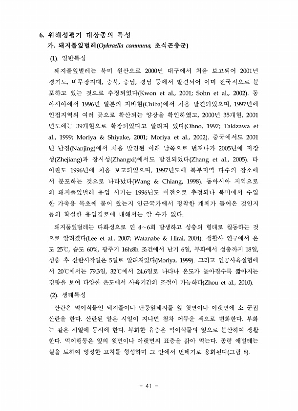 6. 위해성평가 대상종의 특성 가. 돼지풀잎벌레 Ophraella communa, 초식곤충군 1 일반특성 돼지풀잎벌레는 북미 원산으로 2000년 대구에서 처음 보고되어 2001년 경기도, 비무장지대, 충북, 충남, 경남 등에서 발견되어 이미 전국적으로 분 포하고 있는 것으로 추정되었다 Kwon et al., 2001; Sohn et al., 2002 동 아시아에서 1996년 일본의 지바현 Chiba 에서 처음 발견되었으며, 1997년에 인접지역의 여러 곳으로 확산되는 양상을 확인하였고, 2000년 35개현, 2001 년도에는 39개현으로 확장되었다고 알려져 있다 Ohno, 1997; Takizawa et al., 1999; Moriya & Shiyake, 2001; Moriya et al., 2002 중국에...