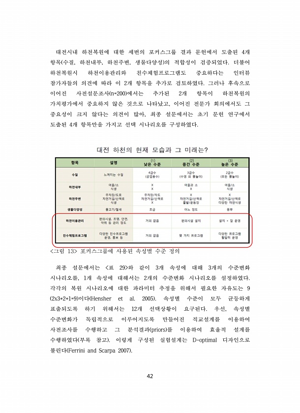 42 대전시내 하천복원에 대한 세번의 포커스그룹 결과 문헌에서 도출된 4개 항목 수질, 하천내부, 하천주변, 생물다양성 의 적합성이 검증되었다. 더불어 하천복원시 하천이용관리와 친수체험프로그램도 중요하다는 인터뷰 참가자들의 의견에 따라 이 2개 항목을 추가로 검토하였다. 그러나 후속으로 이어진 사전설문조사 n=200 에서는 추가된 2개 항목이 하천복원의 가치평가에서 중요하지 않은 것으로 나타났고, 이어진 전문가 회의에서도 그 중요성이 크지 않다는 의견이 많아, 최종 설문에서는 초기 문헌 연구에서 도출된 4개 항목만을 가지고 선택 시나리오를 구성하였다. 그림 13 포커스그룹에 사용된 속성별 수준 정의 최종 설문에서는 표 29 와 같이 3개 속성에 대해 3개의 수준변화 시나리오를, 1개 속성에 대해서는 2개의 ...