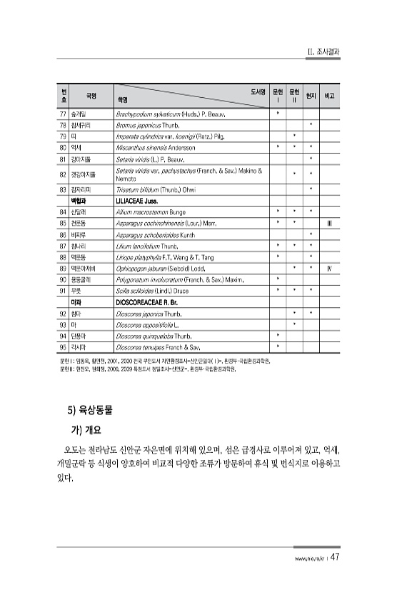 II. 조사결과 www.nie.re.kr ? 47 5 오도는 전라남도 신안군 자은면에 위치해 있으며, 섬은 급경사로 이루어져 있고, 억새, 개밀군락 등 식생이 양호하여 비교적 다양한 조류가 방문하여 휴식 및 번식지로 이용하고 있다. 번 호 국명 도서명 학명 문헌 Ⅰ 문헌 Ⅱ 현지 비고 77 숲개밀 Brachypodium sylvaticum Huds. P. Beauv. * 78 참새귀리 Bromus japonicus Thunb. * 79 띠 Imperata cylindrica var. koenigii Retz. Pilg. * 80 억새 Miscanthus sinensis Andersson * * * 81 강아지풀 Setaria viridis L. P. Beauv. * 82 갯강아지풀 Setaria viridi...