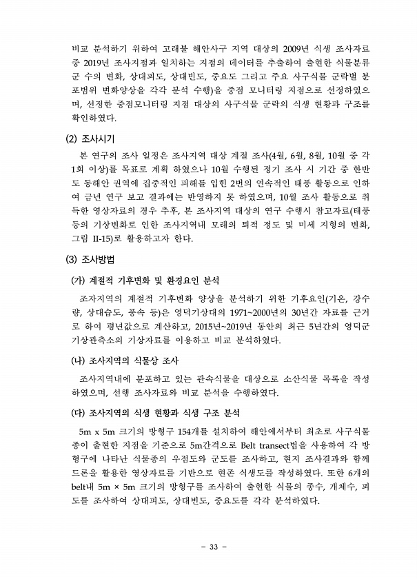 33 비교 분석하기 위하여 고래불 해안사구 지역 대상의 2009년 식생 조사자료 중 2019년 조사지점과 일치하는 지점의 데이터를 추출하여 출현한 식물분류 군 수의 변화, 상대피도, 상대빈도, 중요도 그리고 주요 사구식물 군락별 분 포범위 변화양상을 각각 분석 수행 을 중점 모니터링 지점으로 선정하였으 며, 선정한 중점모니터링 지점 대상의 사구식물 군락의 식생 현황과 구조를 확인하였다. 2 조사시기 본 연구의 조사 일정은 조사지역 대상 계절 조사 4월, 6월, 8월, 10월 중 각 1회 이상 를 목표로 계획 하였으나 10월 수행된 정기 조사 시 기간 중 한반 도 동해안 권역에 집중적인 피해를 입힌 2번의 연속적인 태풍 활동으로 인하 여 금년 연구 보고 결과에는 반영하지 못 하였으며, 10월 조사 활동으로 취...