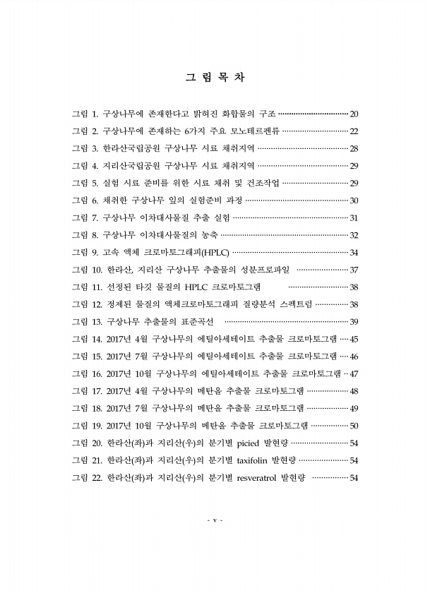 v 그 림 목 차 그림 1. 구상나무에 존재한다고 밝혀진 화합물의 구조 ································20 그림 2. 구상나무에 존재하는 6가지 주요 모노테르펜류 ······························22 그림 3. 한라산국립공원 구상나무 시료 채취지역 ········································· 28 그림 4. 지리산국립공원 구상나무 시료 채취지역 ········································· 29 그림 5. 실험 시료 준비를 위한 시료 채취 및 건조작업 ······························ 29 그림 6. 채취한 구상나무 잎의 실험준비 과정 ·························...