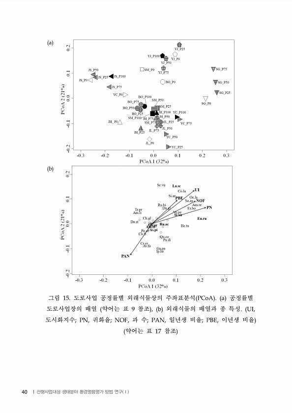 그림 도로사업 공정률별 외래식물상의 주좌표분석 공정률별 도로사업장의 배열 약어는 표 참조 외래식물의 배열과 종 특성 도시화지수 귀화율 과 수 일년생 비율 이년생 비율 약어는 표 참조 40 | 선형사업대상 생태분야 환경영향평가 방법 연구 Ⅰ