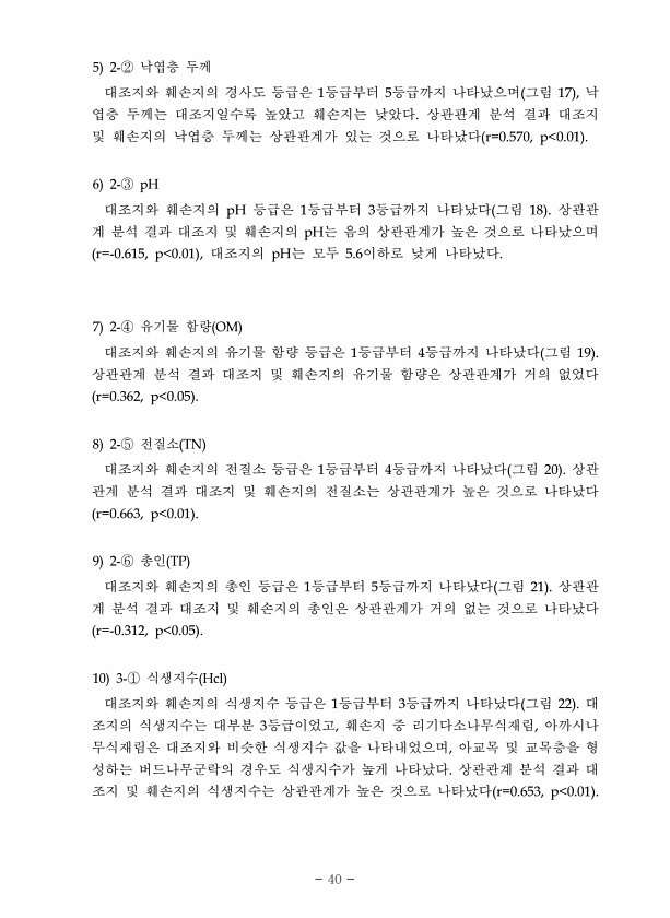? ? ②-5 2 ? 1 ? 5 ? ?? ? ? 17 , ? ? ? ? ? ? ?r=0.570, p 0.01 6 2-③ pH pH ? 1 ? 3 ? ?? ? ? 18 pH ? ? r=-0.615, p 0.01 , pH 5.6 ? ? ? 7 2-④ ? OM ? ? 1 ? 4 ? ?? ? ? 19 ? r=0.362, p 0.05 8 2-⑤ TN ? 1 ? 4 ? ?? ? ? 20 ? ? r=0.663, p 0.01 9 2-⑥ TP ? 1 ? 5 ? ?? ? ? 21 ? ? r=-0.312, p 0.05 10 3-① Hcl ? 1 ? 3 ? ?? ? ? 22 3 ? , ? ? , ? ? ? ? , ? ? ? ? ?r=0.653, p 0.01