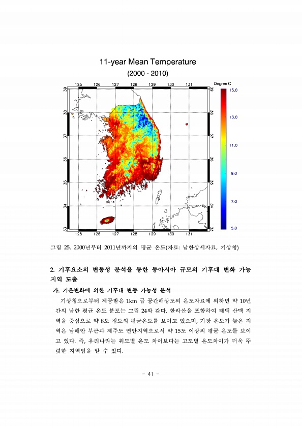 41 그림 25. 2000년부터 2011년까지의 평균 온도 자료남한상세자료, 기상청 2. 기후요소의 변동성 분석을 통한 동아시아 규모의 기후대 변화 가능 지역 도출 가. 기온변화에 의한 기후대 변동 가능성 분석 기상청으로부터 제공받은 1km 급 공간해상도의 온도자료에 의하면 약 10년 간의 남한 평균 온도 분포는 그림 24와 같다. 한라산을 포함하여 태백 산맥 지 역을 중심으로 약 8도 정도의 평균온도를 보이고 있으며, 가장 온도가 높은 지 역은 남해안 부근과 제주도 연안지역으로서 약 15도 이상의 평균 온도를 보이 고 있다. 즉, 우리나라는 위도별 온도 차이보다는 고도별 온도차이가 더욱 뚜 렷한 지역임을 알 수있다.