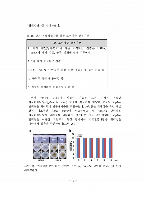 42 위해성평가를 진행하였다. 표 15. 단기 위해성평가를 위한 초식자군 선정기준 2차 초식자군 선정기준 1. 처리 기간 장기·단기 에 따른 초식자군 선정은 USDA, EFSA의 평가 기준, 항목, 범위에 맞게 이루어짐. 2. 2차 단기 초식자군 선정 3. LM 작물 및 단백질에 대한 노출 가능성 및 섭식 가능 종 4. 사육 및 관리가 용이한 종 5. 실험이 용이하여 반복실험 가능 종 먼저 국내에 78월에 채집이 가능한 표적 인시류 곤충인 미국흰불나방 Hyphantria cunea 유충을 확보하여 다양한 농도의 Vip3Aa 단백질을 처리하여 생존개체수를 확인하였다. 10일동안 위해성을 확인 해본 결과 대조구인 Hepes buffer와 비교하였을 때 Vip3Aa 단백질은 미국흰불나방에 위해성을 나타내지 않는다...