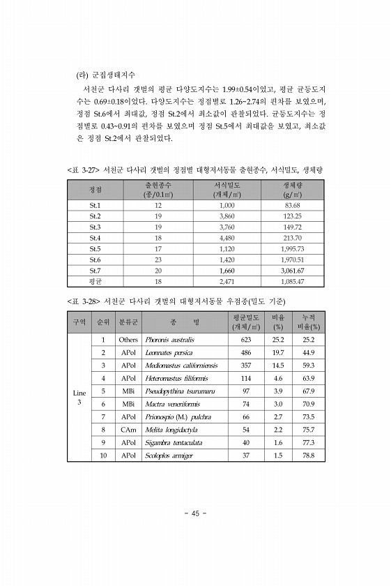 45 라 군집생태지수 서천군 다사리 갯벌의 평균 다양도지수는 1.99±0.54이었고, 평균 균등도지 수는 0.69±0.18이었다. 다양도지수는 정점별로 1.262.74의 편차를 보였으며, 정점 St.6에서 최대값, 정점 St.2에서 최소값이 관찰되었다. 균등도지수는 정 점별로 0.430.91의 편차를 보였으며 정점 St.5에서 최대값을 보였고, 최소값 은 정점 St.2에서 관찰되었다. 정점 출현종수 종/0.1㎡ 서식밀도 개체/㎡ 생체량 g/㎡ St.1 12 1,000 83.68 St.2 19 3,860 123.25 St.3 19 3,760 149.72 St.4 18 4,480 213.70 St.5 17 1,120 1,995.73 St.6 23 1,420 1,970.51 St.7 20 1,660 3,061.6...