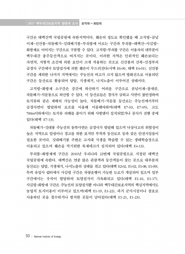 2017 백두대간보호지역 생태계 조사 묘적재 화방재 50 ? National Institute of Ecology 구간은 태백산맥 국립공원에 속한지역이다. 훼손의 정도로 확인했을 때 고직령곰넘 이재신선봉차돌배기깃대베기봉부쇠봉에 이르는 구간과 부쇠봉태백산사길령화방재로 이어지는 구간으로 구분할 수 있다. 고직령부쇠봉 구간은 이용자의 대부분이 백두대간 종주등산객으로 여겨지는 곳이다. 이러한 지역은 인위적인 훼손보다는 자연적, 지형적 조건에 의한 요인이 크게 작용하는 곳으로 신선봉의 산복산정부의 급경사 구간에서 토양침식에 의한 훼손이 두드러진다 서벽 E6-09, 태백 E4-01 신선봉 구간을 제외한 나머지 지역에서는 주능선의 비고가 크지 않으며 방화선으로 이용되던 구간은 등산로로 활용되어 답압, 식생제거, 나지노출...