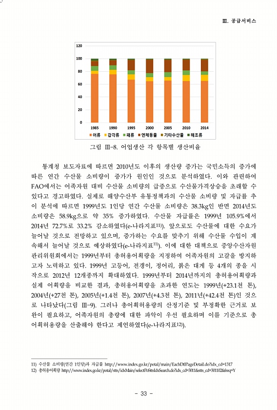 Ⅲ. 공급서비스 33 그림 Ⅲ 8. 어업생산 각 항목별 생산비율 통계청 보도자료에 따르면 2010년도 이후의 생산량 증가는 국민소득의 증가에 따른 연간 수산물 소비량이 증가가 원인인 것으로 분석하였다. 이와 관련하여 FAO에서는 어족자원 대비 수산물 소비량의 급증으로 수산물가격상승을 초래할 수 있다고 경고하였다. 실제로 해양수산부 유통정책과의 수산물 소비량 및 자급률 추 이 분석에 따르면 1999년도 1인당 연간 수산물 소비량은 38.3kg인 반면 2014년도 소비량은 58.9kg으로 약 35% 증가하였다. 수산물 자급률은 1999년 105.9%에서 2014년 72.7%로 33.2% 감소하였다 e-나라지표11 앞으로도 수산물에 대한 수요가 늘어날 것으로 전망하고 있으며, 증가하는 수요를 맞추기 위해 수산물 ...