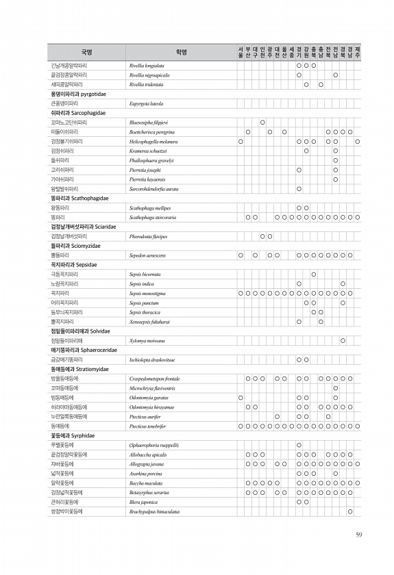 59 긴날개콩알락파리 Rivellia longialata ○ ○ ○ 끝검정콩알락파리 Rivellia nigroapicalis ○ ○ 세띠콩알락파리 Rivellia tridentata ○ ○ 풍뎅이파리과 pyrgotidae 큰풍뎅이파리 Eupyrgota luteola 쉬파리과 Sarcophagidae 꼬마노고단쉬파리 Blaesoxipha flipjevi ○ 떠돌이쉬파리 Boettcherisca peregrina ○ ○ ○ ○ ○ ○ ○ 검정볼기쉬파리 Helicophagella melanura ○ ○ ○ ○ ○ ○ ○ 검정쉬파리 Kramerea schuetzei ○ ○ 돌쉬파리 Phallosphaera gravelyi ○ 고리쉬파리 Pierretia josephi ○ ○ 가야쉬파리 Pierretia kayaen...