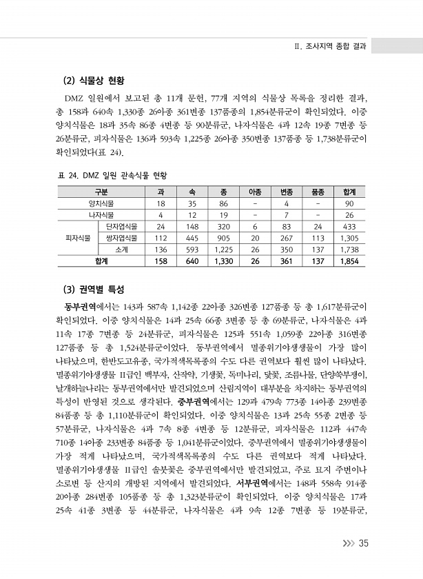Ⅱ. 조사지역 종합 결과 35 2 식물상 현황 DMZ 일원에서 보고된 총 11개 문헌, 77개 지역의 식물상 목록을 정리한 결과, 총 158과 640속 1,330종 26아종 361변종 137품종의 1,854분류군이 확인되었다. 이중 양치식물은 18과 35속 86종 4변종 등 90분류군, 나자식물은 4과 12속 19종 7변종 등 26분류군, 피자식물은 136과 593속 1,225종 26아종 350변종 137품종 등 1,738분류군이 확인되었다 표 24 구분 과 속 종 아종 변종 품종 합계 양치식물 18 35 86 4 90 나자식물 4 12 19 7 26 피자식물 단자엽식물 24 148 320 6 83 24 433 쌍자엽식물 112 445 905 20 267 113 1,305 소계 136 593 1,225 26...