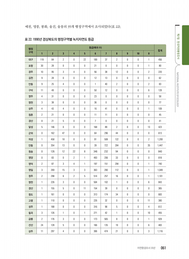 예천, 영풍, 봉화, 울진, 울릉의 35개 행정구역에서 조사되었다 표 22 표 22. 1990년 경상북도의 행정구역별 녹지자연도 등급 행정 구역 등급 메쉬 수 합계 1 2 3 4 5 6 7 8 9 10 0 대구 119 84 2 0 22 189 37 2 0 0 1 456 포항 30 28 0 0 0 21 0 0 0 0 1 80 경주 10 95 3 4 0 56 38 12 0 0 2 220 김천 9 28 0 0 0 12 13 0 0 0 0 62 안동 9 25 4 0 0 1 40 2 0 0 2 83 구미 11 49 0 0 0 50 12 0 0 0 6 128 영주 4 31 0 0 0 23 0 0 0 0 0 58 영천 3 38 0 0 0 36 0 0 0 0 0 77 상주 4 43 4 0 0 16 41 0 0 0 1 10...