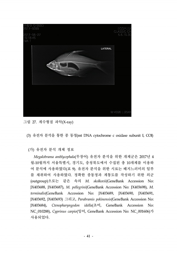 41 그림 27. 계수형질 파악 X-ray 3 유전자 분석을 통한 종 동정 mt DNA cytochrome c oxidase subunit I, COI 가 유전자 분석 개체 정보 Megalobrama amblycephala 무창어 유전자 분석을 위한 개체군은 2017년 4 월-10월까지 서울특별시, 경기도, 충청북도에서 수집된 총 10개체를 이용하 여 분석에 사용하였다 표 9 유전자 분석을 위한 시료는 배지느러미의 일부 를 채취하여 사용하였다. 정확한 종동정과 계통도를 작성하기 위한 외군 outgroup 으로는 같은 속의 M. skolkovii GeneBank Accession NoJX403688, JX403687 , M. pellegrini GeneBank Accession NoJX403698 , M. t...