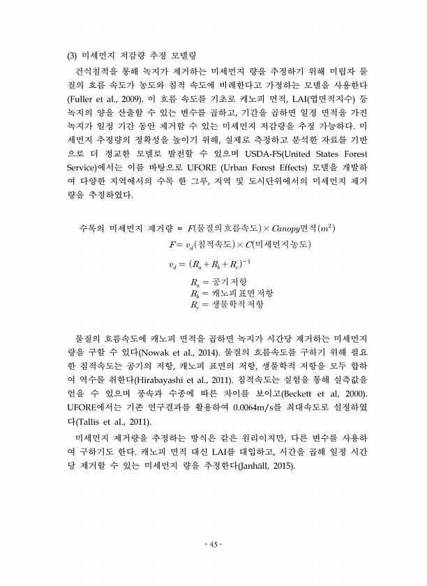 43 미세먼지 저감량 추정 모델링 건식침적을 통해 녹지가 제거하는 미세먼지 량을 추정하기 위해 미립자 물 질의 흐름 속도가 농도와 침적 속도에 비례한다고 가정하는 모델을 사용한다 이 흐름 속도를 기초로 캐노피 면적 엽면적지수 등 녹지의 양을 산출할 수 있는 변수를 곱하고 기간을 곱하면 일정 면적을 가진 녹지가 일정 기간 동안 제거할 수 있는 미세먼지 저감량을 추정 가능하다 미 세먼지 추정량의 정확성을 높이기 위해 실제로 측정하고 분석한 자료를 기반 으로 더 정교한 모델로 발전할 수 있으며 에서는 이를 바탕으로 모델을 개발하 여 다양한 지역에서의 수목 한 그루 지역 및 도시단위에서의 미세먼지 제거 량을 추정하였다 수목의 미세먼지 제거량 물질의흐름속도 × ?????면적? ? ?침적속도 ×...