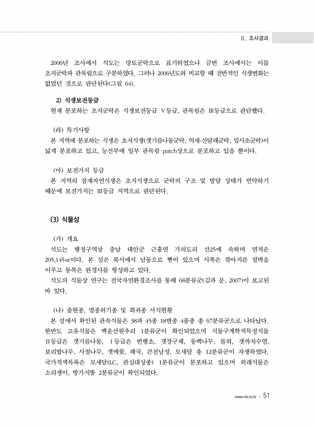 Ⅱ. 조사결과 www.nie.re.kr ? 51 2006년 조사에서 석도는 망토군락으로 표기하였으나 금번 조사에서는 이를 초지군락과 관목림으로 구분하였다. 그러나 2006년도와 비교할 때 전반적인 식생변화는 없었던 것으로 판단된다 그림 64 2 식생보전등급 현재 분포하는 초지군락은 식생보전등급 Ⅴ등급, 관목림은 Ⅲ등급으로 판단했다. 라 특기사항 본 지역에 분포하는 식생은 초지식생 갯기름나물군락, 억새-산달래군락, 밀사초군락 이 넓게 분포하고 있고, 능선부에 일부 관목림 patch상으로 분포하고 있을 뿐이다. 마 보전가치 등급 본 지역의 잠재자연식생은 초지식생으로 군락의 구조 및 발달 상태가 빈약하기 때문에 보전가치는 Ⅲ등급 지역으로 판단된다. 3 식물상 가 개요 석도는 행정구역상 충남 태안군 근흥면 가의도리...