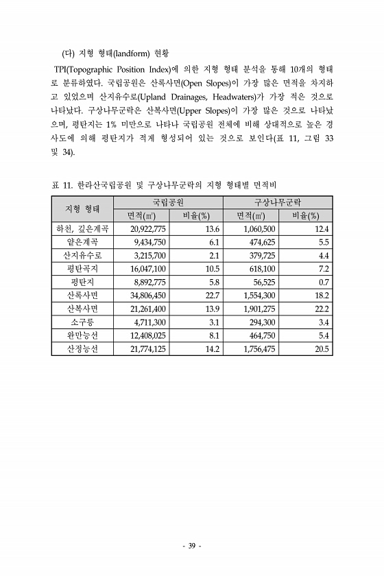 39 다 지형 형태 landform 현황 TPI Topographic Position Index 에 의한 지형 형태 분석을 통해 10개의 형태 로 분류하였다. 국립공원은 산록사면 Open Slopes 이 가장 많은 면적을 차지하 고 있었으며 산지유수로 Upland Drainages, Headwaters 가 가장 적은 것으로 나타났다. 구상나무군락은 산복사면 Upper Slopes 이 가장 많은 것으로 나타났 으며, 평탄지는 1% 미만으로 나타나 국립공원 전체에 비해 상대적으로 높은 경 사도에 의해 평탄지가 적게 형성되어 있는 것으로 보인다 표 11, 그림 33 및 34 지형 형태 국립공원 구상나무군락 면적 ㎡ 비율 % 면적 ㎡ 비율 % 하천, 깊은계곡 20,922,775 13.6 1,060,500 12.4 ...