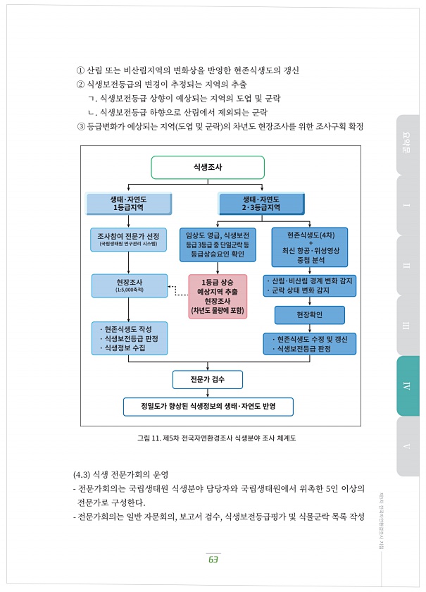① 산림?또는?비산림지역의?변화상을?반영한?현존식생도의?갱신 ② 식생보전등급의?변경이?추정되는?지역의?추출 ?. 식생보전등급?상향이?예상되는?지역의?도엽?및?군락 ?. 식생보전등급?하향으로?산림에서?제외되는?군락 ③ 등급변화가?예상되는?지역 도엽?및?군락 의?차년도?현장조사를?위한?조사구획?확정 그림 11. 제5차?전국자연환경조사?식생분야?조사?체계도 ?.? 식생?전문가회의?운영 전문가회의는?국립생태원?식생분야?담당자와?국립생태원에서?위촉한 ?인?이상의 전문가로?구성한다. 전문가회의는?일반?자문회의, 보고서?검수, 식생보전등급평가?및?식물군락?목록?작성 63 제5차 전국자연환경조사 지침 요약문 Ⅰ Ⅱ Ⅲ Ⅳ Ⅴ 생태·자연도 1등급지역 생태·자연도 2·3등급지역 조사참여?전문가?선정 국립생태원?연구관리?시스템...