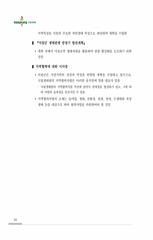 50 지역특성을 서천의 주요한 자연생태 특성으로 판단하여 계획을 수립함 ? 『서천군 생태관광 중장기 발전계획』 ? 계획 자체가 서천군의 생태자원을 활용하여 관광 활성화를 도모하기 위한 것임 ? 지역협력에 대한 시사점 ? 서천군은 서천지역의 강점과 특성을 반영한 계획을 수립하고 있으므로, 국립생태원의 지역협력사업은 이러한 움직임에 맞출 필요가 있음 국립생태원의 지역협력사업 추진에 있어서 연계점을 형성하기 쉽고, 그에 따 라 사업의 효과성을 증진시킬 수 있음 ? 지역협력사업의 소재는 농어업, 생태, 친환경, 관광, 철새, 수생태와 육상 생태 등을 대상으로 하여 협력사업을 마련하여야 할것임