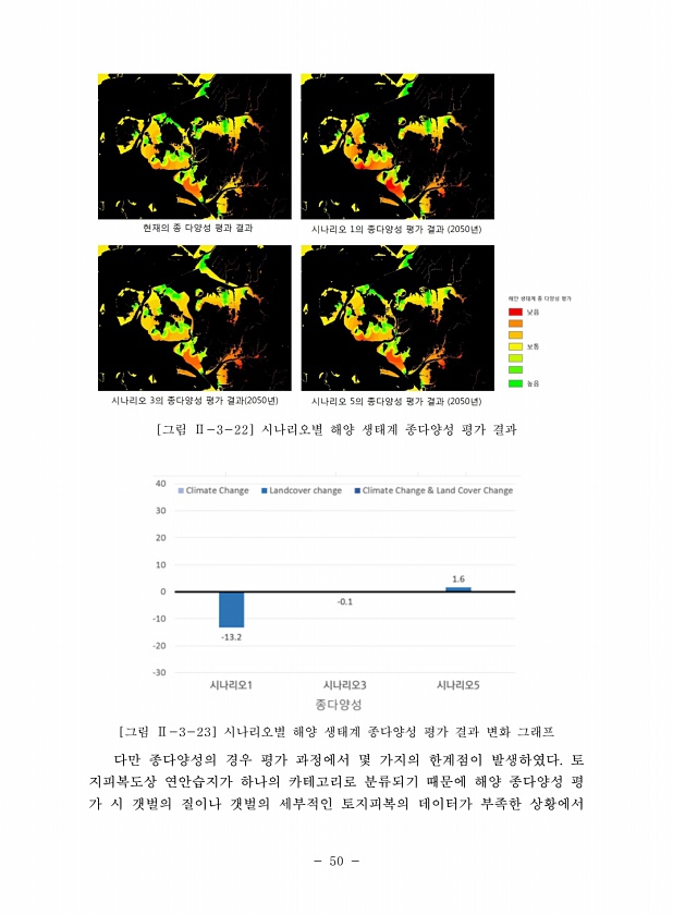 50 [그림 Ⅱ-3-22] 시나리오별 해양 생태계 종다양성 평가 결과 [그림 Ⅱ-3-23] 시나리오별 해양 생태계 종다양성 평가 결과 변화 그래프 다만 종다양성의 경우 평가 과정에서 몇 가지의 한계점이 발생하였다. 토 지피복도상 연안습지가 하나의 카테고리로 분류되기 때문에 해양 종다양성 평 가 시 갯벌의 질이나 갯벌의 세부적인 토지피복의 데이터가 부족한상황에서