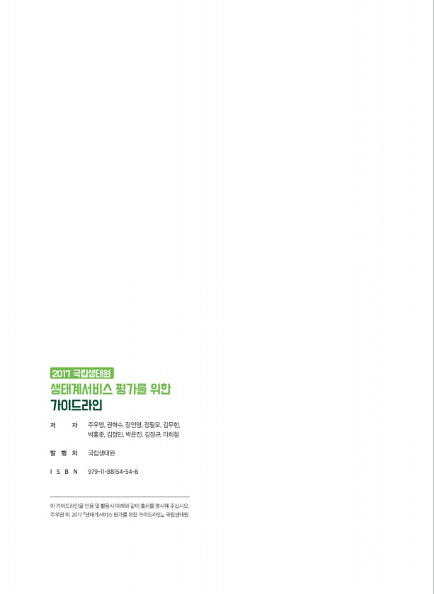 주우영, 권혁수, 장인영, 정필모, 김무한, 박홍준, 김정인, 박은진, 김정규, 이희철 국립생태원 저 자 발 행 처 I S B N 979-11-88154-54-8 이 가이드라인을 인용 및 활용시 아래와 같이 출처를 명시해 주십시오. 주우영 외. 2017. 『생태계서비스 평가를 위한 가이드라인』. 국립생태원. 생태계서비스 평가를 위한 가이드라인 2017국립생태원