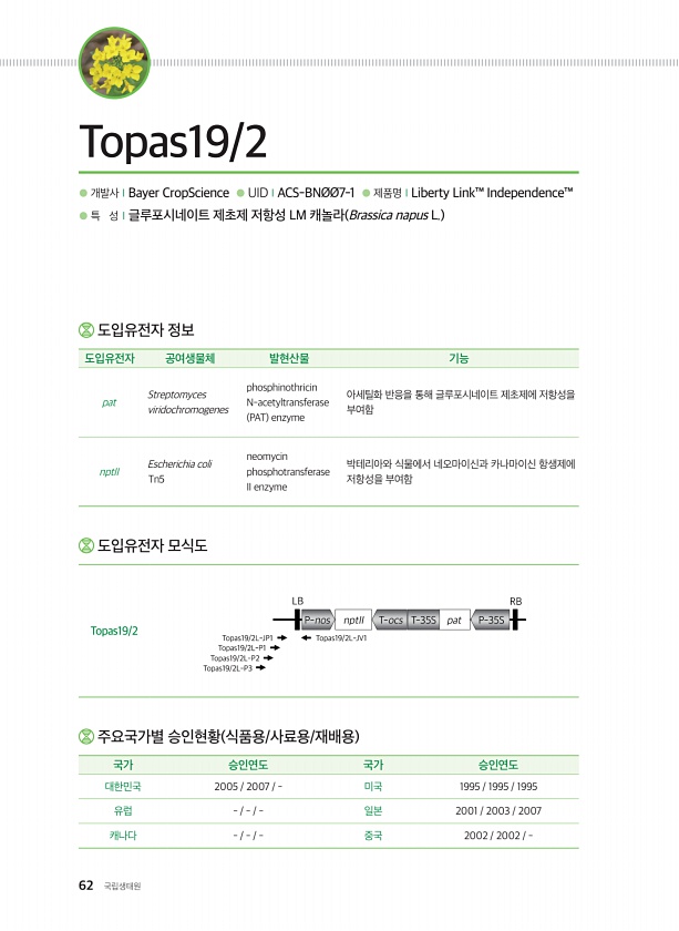 62 국립생태원 ● 개발사ⅠBayer CropScience ● UIDⅠACS-BNØØ7-1 ● 제품명ⅠLiberty Link™ Independence™ ● 특 성Ⅰ글루포시네이트 제초제 저항성 LM 캐놀라 Brassica napus L. Topas19/2 주요국가별 승인현황 식품용/사료용/재배용 국가 승인연도 국가 승인연도 대한민국 2005 2007 미국 1995 1995 1995 유럽 일본 2001 2003 2007 캐나다 중국 2002 2002 도입유전자 정보 도입유전자 공여생물체 발현산물 기능 pat Streptomyces viridochromogenes phosphinothricin N-acetyltransferase PAT enzyme 아세틸화 반응을 통해 글루포시네이트 제초제에 저항성을 부여함 np...