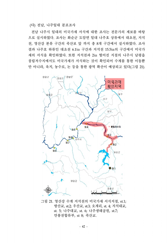 42 다 전남, 나주일대 분포조사 전남 나주시 일대의 미국가재 서식에 대한 조사는 전문가의 제보를 바탕 으로 실시하였다. 조사는 화순군 도암면 일대 나주호 상류에서 대초천, 지석 천, 영산강 본류 구간의 죽산보 앞 까지 총 8개 구간에서 실시하였다. 조사 결과 나주호 하류인 대초천 6.1㎞ 구간과 지석천 15.5㎞의 구간에서 미국가 재의 서식을 확인하였다. 또한 지석천과 2㎞ 떨어진 지점의 나주시 남평읍 풍림저수지에서도 미국가재가 서식하는 것이 확인되어 수계를 통한 이동뿐 만 아니라, 육지, 농수로, 논 등을 통한 광역 확산이 예상되고 있다 그림 21 그림 21. 영산강 수계 지석천의 미국가재 서식지점, st.1; 방산교, st.2; 우산교, st.3; 오계리, st. 4; 지석대교, st. 5; 나주대교,...