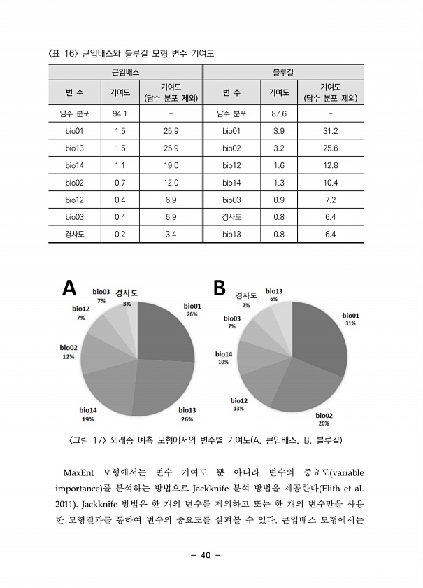 40 큰입배스 블루길 변 수 기여도 기여도 담수 분포 제외 변 수 기여도 담수기여도 분포 제외 담수 분포 94.1 담수 분포 87.6 bio01 1.5 25.9 bio01 3.9 31.2 bio13 1.5 25.9 bio02 3.2 25.6 bio14 1.1 19.0 bio12 1.6 12.8 bio02 0.7 12.0 bio14 1.3 10.4 bio12 0.4 6.9 bio03 0.9 7.2 bio03 0.4 6.9 경사도 0.8 6.4 경사도 0.2 3.4 bio13 0.8 6.4 표 16 큰입배스와 블루길 모형 변수 기여도 그림 17 외래종 예측 모형에서의 변수별 기여도 A. 큰입배스, B. 블루길 MaxEnt 모형에서는 변수 기여도 뿐 아니라 변수의 중요도 variable importance 를 분...