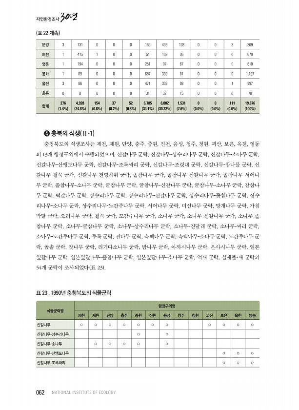 문경 3 131 0 0 0 165 439 128 0 0 3 869 예천 1 415 1 0 0 54 163 36 0 0 0 670 영풍 1 194 0 0 0 251 97 67 0 0 0 610 봉화 1 89 0 0 0 687 339 81 0 0 0 1,197 울진 3 86 0 0 0 471 338 98 0 0 1 997 울릉 0 0 0 0 0 31 32 15 0 0 0 78 합계 276 1.4% 4,928 24.8% 154 0.8% 37 0.2% 52 0.3% 6,785 34.1% 6,002 30.22% 1,531 7.6% 0 0.0% 0 0.0% 111 0.6% 19,876 100% ? 충북의 식생 Ⅱ-1 충청북도의 식생조사는 제천, 제원, 단양, 충주, 중원, 진천, 음성, 청주, 청원, 괴산, 보은, 옥...