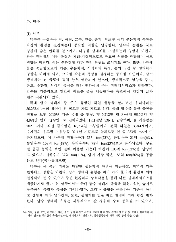 -40- 다 담수 서론 담수를 구성하는 강 하천 호수 연못 습지 지표수 등의 수문학적 순환은 육상의 환경을 결정하는데 중요한 역할을 담당한다 담수의 순환은 국토 경관에 많은 변화를 일으키며 다양한 생태계를 조성하는데 영향을 미친다 담수 생태계의 여러 유형은 지리 지형적으로도 중요한 역할을 담당하며 상호 영향을 미친다 이는 수환경에 대한 관리 단위로 쓰이기도 한다 또한 하류에 물을 공급함으로써 기온 수문학적 서식처의 특성 종의 구성 등 생태학적 영향을 미치게 되며 그러한 작용과 특성을 결정하는 중요한 요인이다 담수 생태계는 전 국토에 걸쳐 상호 연관되어 있으며 생태적으로 영향을 주고 온도 수환경 서식지 특성을 따라 인간에게 주는 생태계서비스가 달라진다 담수는 기본적으로 인간에 이로운 물을 제공한다는 측면에서 ...