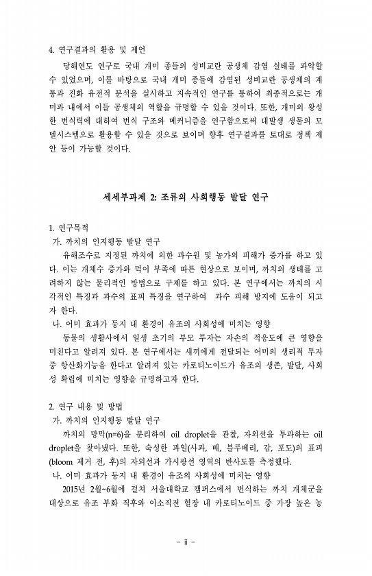 4. 연구결과의 활용 및 제언 당해연도 연구로 국내 개미 종들의 성비교란 공생체 감염 실태를 파악할 수 있었으며, 이를 바탕으로 국내 개미 종들에 감염된 성비교란 공생체의 계 통과 진화 유전적 분석을 실시하고 지속적인 연구를 통하여 최종적으로는 개 미과 내에서 이들 공생체의 역할을 규명할 수 있을 것이다. 또한, 개미의 왕성 한 번식력에 대하여 번식 구조와 메커니즘을 연구함으로써 대발생 생물의 모 델시스템으로 활용할 수 있을 것으로 보이며 향후 연구결과를 토대로 정책 제 안 등이 가능할 것이다. 세세부과제 2조류의 사회행동 발달 연구 1. 연구목적 가. 까치의 인지행동 발달 연구 유해조수로 지정된 까치에 의한 과수원 및 농가의 피해가 증가를 하고 있 다. 이는 개체수 증가와 먹이 부족에 따른 현상으로 보이며...