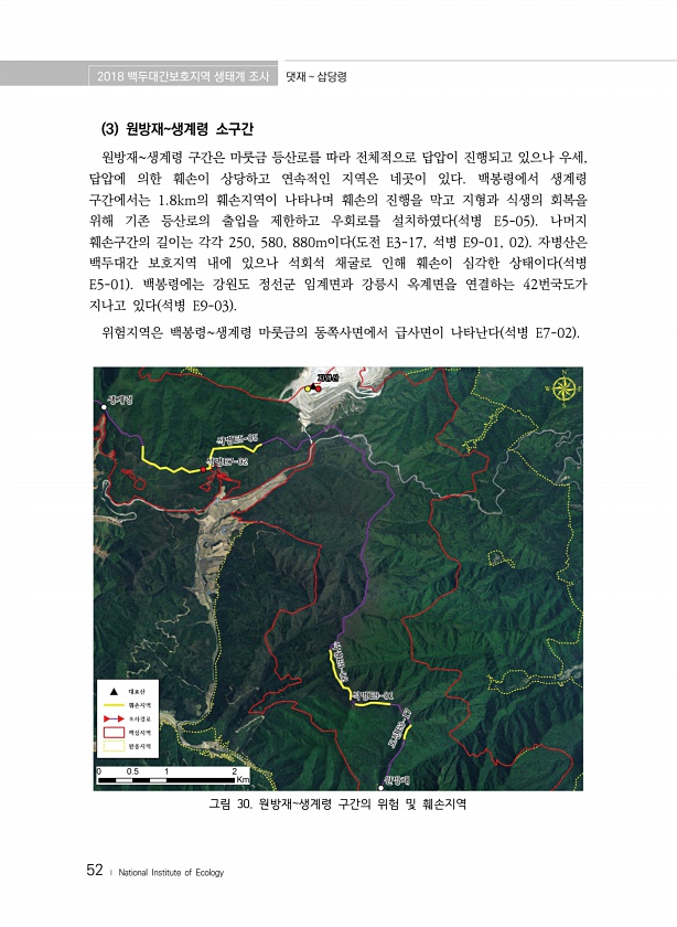 2018 백두대간보호지역 생태계 조사 댓재 삽당령 52 ? National Institute of Ecology 3 원방재생계령 소구간 원방재생계령 구간은 마룻금 등산로를 따라 전체적으로 답압이 진행되고 있으나 우세, 답압에 의한 훼손이 상당하고 연속적인 지역은 네곳이 있다. 백봉령에서 생계령 구간에서는 1.8km의 훼손지역이 나타나며 훼손의 진행을 막고 지형과 식생의 회복을 위해 기존 등산로의 출입을 제한하고 우회로를 설치하였다 석병 E5-05 나머지 훼손구간의 길이는 각각 250, 580, 880m이다 도전 E3-17, 석병 E9-01, 02 자병산은 백두대간 보호지역 내에 있으나 석회석 채굴로 인해 훼손이 심각한 상태이다 석병 E5-01 백봉령에는 강원도 정선군 임계면과 강릉시 옥계면을 연결하는 42번...