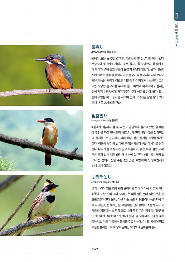 059 괴산 산 산 산 산 산 산산 산 산 노랑턱멧새 Emberiza elegans 멧새과 크기나 깃이 언뜻 참새처럼 보이지만 부리 아래쪽 턱 밑과 머리 뒤쪽에 노란 깃이 있다. 머리깃은 삐죽 뻗쳤는데, 이런 것을 관 모 冠毛 라 한다. 물가, 야산 기슭, 들판의 덤불이나 농경지에 주 로 지내는데, 번식기인 봄, 여름에는 산기슭에서 조용히 지내고, 가을과 겨울에는 넓은 곳으로 나와 무리 지어 지내며, “호잇 호 잇 호이 호이”하며 요란하게 운다. 봄, 여름에는 곤충을 주로 잡아먹고, 가을, 겨울에는 풀씨를 주로 먹는데, 이처럼 새들이 먹고 배설한 풀씨는 그대로 땅에 떨어진 씨앗보다 발아율이 높다. 청호반새 Halcyon pileata 물총새과 4월에서 9월까지 볼 수 있는 여름철새다. 물가에 있는 흙 벼랑 ...