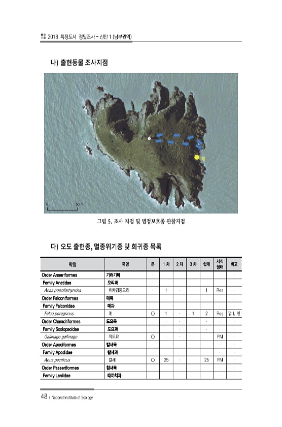 2018 특정도서 정밀조사 신안 1 남부권역 48 ? National Institute of Ecology 그림 5. 조사 지점 및 법정보호종 관찰지점 , 학명 국명 문 1 차 2 차 3 차 합계 서식 형태 비고 Order Anseriformes 기러기목 Family Anatidae 오리과 Anas poecilorhyncha 흰뺨검둥오리 1 1 Res Order Falconiformes 매목 Family Falconidae 매과 Falco peregrinus 매 ○ 1 1 2 Res 멸 I, 천 Order Charadriformes 도요목 Family Scolopacidae 도요과 Gallinago gallinago 꺅도요 ○ PM Order Apodiformes 칼새목 Family...