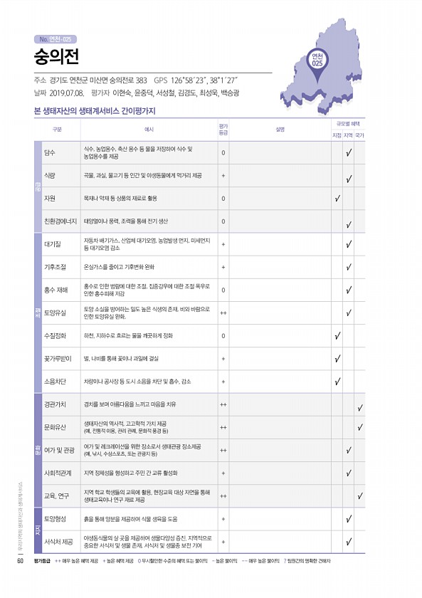 No. 연천- 연천 025 본 생태자산의 생태계서비스 간이평가지 구분 예시 평가 등급 설명 규모별 혜택 지점 지역 국가 공급 담수 식수, 농업용수, 축산 용수 등 물을 저장하여 식수 및 농업용수를 제공 0 √ 식량 곡물, 과실, 물고기 등 인간 및 야생동물에게 먹거리 제공 + √ 자원 목재나 약재 등 상품의 재료로 활용 0 √ 친환경에너지 태양열이나 풍력, 조력을 통해 전기 생산 0 √ 조절 대기질 자동차 배기가스, 산업체 대기오염, 농업발생 먼지, 미세먼지 등 대기오염 감소 + √ 기후조절 온실가스를 줄이고 기후변화 완화 + √ 홍수 재해 홍수로 인한 범람에 대한 조절, 집중강우에 대한 조절 폭우로 인한 홍수피해 저감 0 √ 토양유실 토양 소실을 방어하는 밀도 높은 식생의 존재, 비와 바람으로 인한 토양유...