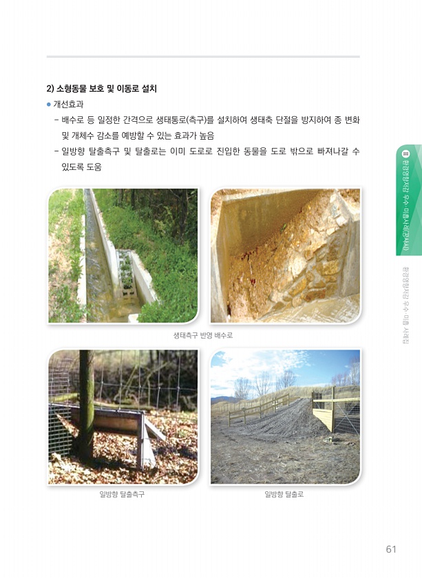 61 환경영향저감 우수·미흡사례 공사시 환경영향저감 우수·미흡 사례집 생태측구 반영 배수로 일방향 탈출측구 일방향 탈출로 2 소형동물 보호 및 이동로 설치 ● 개선효과 배수로 등 일정한 간격으로 생태통로 측구 를 설치하여 생태축 단절을 방지하여 종 변화 및 개체수 감소를 예방할 수 있는 효과가 높음 일방향 탈출측구 및 탈출로는 이미 도로로 진입한 동물을 도로 밖으로 빠져나갈 수 있도록도움