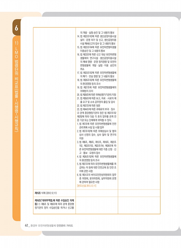6 62 _ 환경부 유전자변형생물체 안전관리 가이드 1 L M O 법령단위 비교표 법률- 시행령- 시행규칙 제15조 삭제 2012.12.11 제16조 「대외무역법」에 따른 수입승인 의제 등 ① 제8조 및 제9조에 따라 관계 중앙행 정기관의 장이 수입승인을 하거나 신고를 의 개발ㆍ실험 승인 및 그 내용의 통보 14. 법 제22조의3에 따른 생산공정이용시설 설치ㆍ운영 허가 및 신고, 생산공정이용 시설 폐쇄신고의 접수 및 그 내용의 통보 15. 법 제22조의4에 따른 유전자변형미생물 이용승인 및 그 내용의 통보 16. 법 제23조에 따른 신고 대상 유전자변형 생물체의 연구시설ㆍ생산공정이용시설 의 폐쇄 명령ㆍ운영 정지명령 및 유전자 변형생물체 개발ㆍ실험ㆍ이용 승인의 취소 17. 법 제23조의2에 따른 유전자변형생물...
