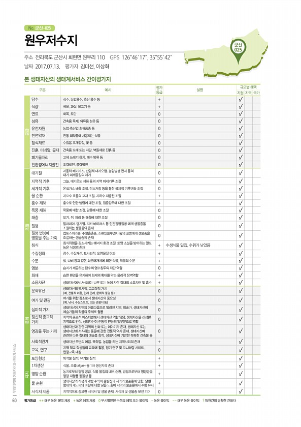 No. 군산- 군산 025 본 생태자산의 생태계서비스 간이평가지 구분 예시 평가 등급 설명 규모별 혜택 지점 지역 국가 공급 담수 식수, 농업용수, 축산 용수 등 + √ 식량 곡물, 과실, 물고기 등 + √ 연료 화목, 토탄 0 √ 섬유 건축용 목재, 의류용 섬유 등 0 √ 유전자원 농업·축산업 희귀품종 등 0 √ 천연약재 전통 의약품에 사용되는 식물 0 √ 장식재료 수집용 조개껍질, 꽃 등 0 √ 진흙, 미네랄, 골재 건축용 모래 또는 자갈, 벽돌재료 진흙 등 0 √ 폐기물처리 고체 쓰레기 하치, 폐수 방류 등 0 √ 친환경에너지발전 조력발전, 풍력발전 0 √ 조절 대기질 자동차 배기가스, 산업체 대기오염, 농업발생 먼지 등의 대기 미세물질의 제거 0 √ 지역적 기후 그늘, 대기온도 저하 등의 지역 미세기...