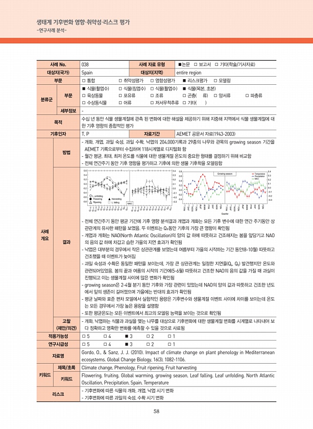 58 생태계 기후변화 영향·취약성·리스크 평가 -연구사례 분석- 사례 No. 038 사례 자료 유형 ■논문 □ 보고서 □ 기타 학술/기사자료 대상지 국가 Spain 대상지 지역 entire region 부문 □ 통합 □ 취약성평가 □ 영향성평가 ■ 리스크평가 □ 모델링 분류군 부문 ■ 식물 활엽수 □ 식물 침엽수 □ 식물 활엽수 ■ 식물 목본, 초본 □ 육상동물 □ 포유류 □ 조류 □ 곤충 류 □ 양서류 □ 파충류 □ 수상동식물 □ 어류 □ 저서무척추류 □ 기타 세부정보 목적 수십 년 동안 식물 생물계절에 관측 된 변화에 대한 해설을 제공하기 위해 지중해 지역에서 식물 생물계절에 대 한 기후 영향의 종합적인 평가 기후인자 T, P 자료기간 AEMET 공문서 자료 1943-2003 사례 개요 방법 개화, 개엽...