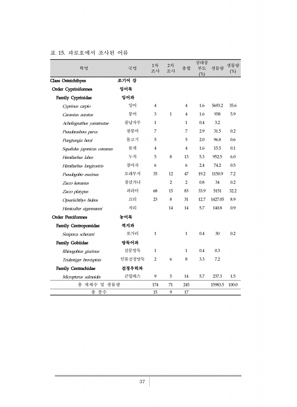 37 학명 국명 1차 조사 2차 조사 총합 상대풍 부도 % 생물량 생물량 % Class Osteichthyes 조기어 강 Order Cypriniformes 잉어목 Family Cyprinidae 잉어과 Cyprinus carpio 잉어 4 4 1.6 5693.2 35.6 Carassius auratus 붕어 3 1 4 1.6 938 5.9 Acheilognathus yamatsutae 줄납자루 1 1 0.4 3.2 Pseudorasbora parva 참붕어 7 7 2.9 31.5 0.2 Pungtungia herzi 돌고기 5 5 2.0 96.8 0.6 Squalidus japonicus coreanus 몰개 4 4 1.6 15.5 0.1 Hemibarbus labeo 누치 5 8 13 5.3 952.5 ...