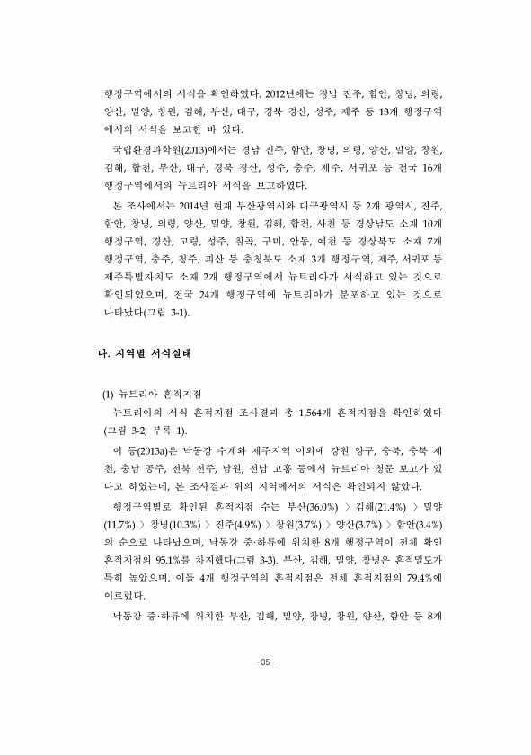 -35- 행정구역에서의 서식을 확인하였다. 2012년에는 경남 진주, 함안, 창녕, 의령, 양산, 밀양, 창원, 김해, 부산, 대구, 경북 경산, 성주, 제주 등 13개 행정구역 에서의 서식을 보고한 바 있다. 국립환경과학원 2013 에서는 경남 진주, 함안, 창녕, 의령, 양산, 밀양, 창원, 김해, 합천, 부산, 대구, 경북 경산, 성주, 충주, 제주, 서귀포 등 전국 16개 행정구역에서의 뉴트리아 서식을 보고하였다. 본 조사에서는 2014년 현재 부산광역시와 대구광역시 등 2개 광역시, 진주, 함안, 창녕, 의령, 양산, 밀양, 창원, 김해, 합천, 사천 등 경상남도 소재 10개 행정구역, 경산, 고령, 성주, 칠곡, 구미, 안동, 예천 등 경상북도 소재 7개 행정구역, 충주, 청주, 괴산 등 충청북도...