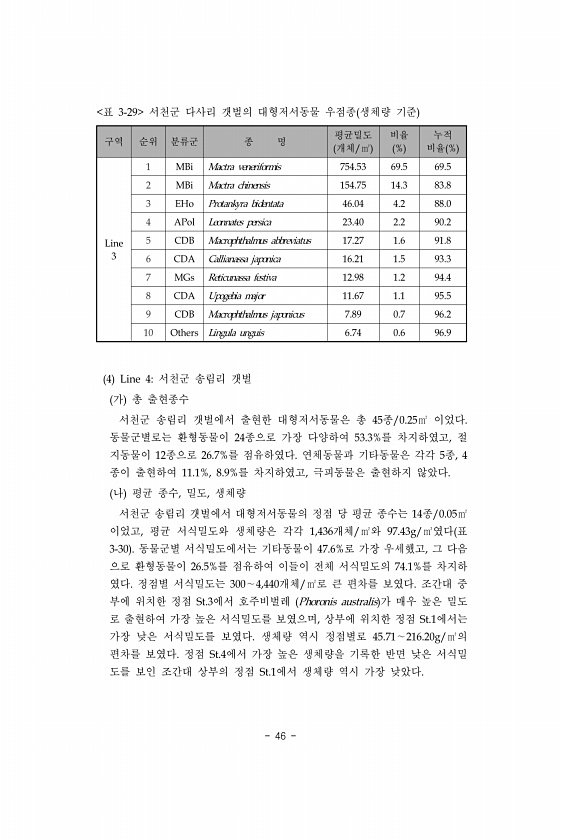 46 구역 순위 분류군 종 명 평균밀도 개체/㎡ 비율 % 누적 비율 % Line 3 1 MBi Mactra veneriformis 754.53 69.5 69.5 2 MBi Mactra chinensis 154.75 14.3 83.8 3 EHo Protankyra bidentata 46.04 4.2 88.0 4 APol Leonnates persica 23.40 2.2 90.2 5 CDB Macrophthalmus abbreviatus 17.27 1.6 91.8 6 CDA Callianassa japonica 16.21 1.5 93.3 7 MGs Reticunassa festiva 12.98 1.2 94.4 8 CDA Upogebia major 11.67 1.1 95.5 9 CDB Macrophthalmus ...