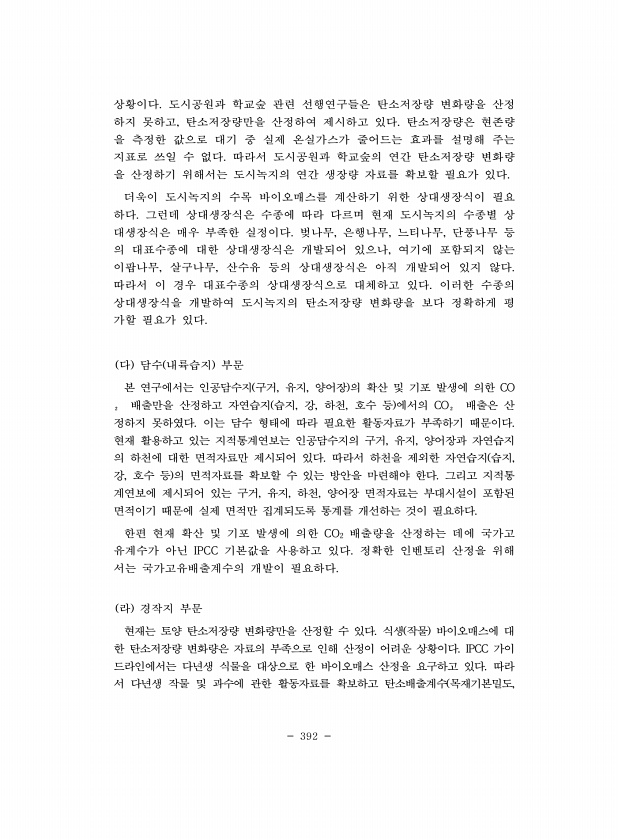 392 상황이다. 도시공원과 학교숲 관련 선행연구들은 탄소저장량 변화량을 산정 하지 못하고, 탄소저장량만을 산정하여 제시하고 있다. 탄소저장량은 현존량 을 측정한 값으로 대기 중 실제 온실가스가 줄어드는 효과를 설명해 주는 지표로 쓰일 수 없다. 따라서 도시공원과 학교숲의 연간 탄소저장량 변화량 을 산정하기 위해서는 도시녹지의 연간 생장량 자료를 확보할 필요가 있다. 더욱이 도시녹지의 수목 바이오매스를 계산하기 위한 상대생장식이 필요 하다. 그런데 상대생장식은 수종에 따라 다르며 현재 도시녹지의 수종별 상 대생장식은 매우 부족한 실정이다. 벚나무, 은행나무, 느티나무, 단풍나무 등 의 대표수종에 대한 상대생장식은 개발되어 있으나, 여기에 포함되지 않는 이팝나무, 살구나무, 산수유 등의 상대생장식은 아직 개발...
