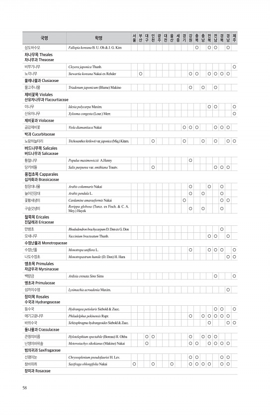 58 삼도하수오 Fallopia koreana B. U. Oh & J. G. Kim ○ ○ ○ ○ 차나무목 Theales 차나무과 Theaceae 비쭈기나무 Cleyera japonica Thunb. ○ 노각나무 Stewartia koreana Nakai ex Rehder ○ ○ ○ ○ ○ ○ ○ 물레나물과 Clusiaceae 물고추나물 Triadenum japonicum Blume Makino ○ ○ ○ 제비꽃목 Violales 산유자나무과 Flacourtiaceae 이나무 Idesia polycarpa Maxim. ○ ○ ○ 산유자나무 Xylosma congesta Lour. Merr. ○ 제비꽃과 Violaceae 금강제비꽃 Viola diamantiaca Nakai ○ ○ ○ ○ ○ ○ 박과 Cucu...