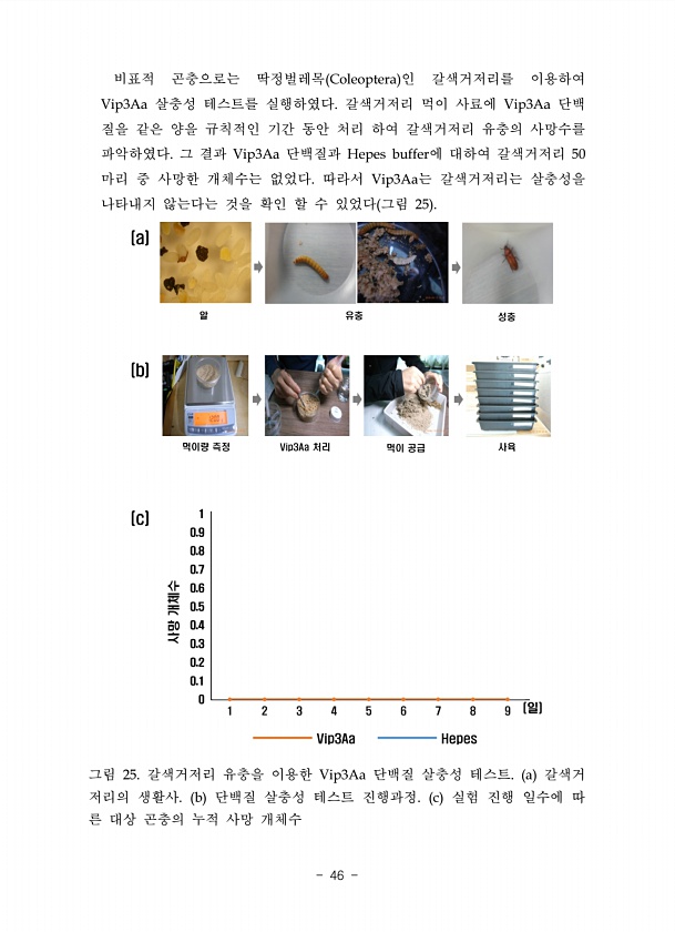 비표적 곤충으로는 딱정벌레목 Coleoptera 인 갈색거저리를 이용하여 Vip3Aa 살충성 테스트를 실행하였다. 갈색거저리 먹이 사료에 Vip3Aa 단백 질을 같은 양을 규칙적인 기간 동안 처리 하여 갈색거저리 유충의 사망수를 파악하였다. 그 결과 Vip3Aa 단백질과 Hepes buffer에 대하여 갈색거저리 50 마리 중 사망한 개체수는 없었다. 따라서 Vip3Aa는 갈색거저리는 살충성을 나타내지 않는다는 것을 확인 할 수 있었다 그림 25 그림 25. 갈색거저리 유충을 이용한 Vip3Aa 단백질 살충성 테스트. a 갈색거 저리의 생활사. b 단백질 살충성 테스트 진행과정. c 실험 진행 일수에 따 른 대상 곤충의 누적 사망개체수