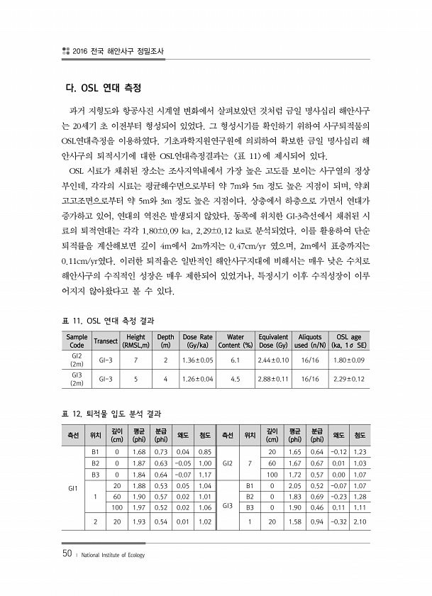 2016 전국 해안사구 정밀조사 50 ? National Institute of Ecology 측선 위치 깊이 cm 평균 phi 분급 phi 왜도 첨도 측선 위치 cm 깊이 phi 평균 phi 분급 왜도 첨도 GI1 B1 0 1.68 0.73 0.04 0.85 GI2 7 20 1.65 0.64 -0.12 1.23 B2 0 1.87 0.63 -0.05 1.00 60 1.67 0.67 0.01 1.03 B3 0 1.84 0.64 -0.07 1.17 100 1.72 0.57 0.00 1.07 1 20 1.88 0.53 0.05 1.04 GI3 B1 0 2.05 0.52 -0.07 1.07 60 1.90 0.57 0.02 1.01 B2 0 1.83 0.69 -0.23 1.28 100 1.97 0.52 0.02 1....