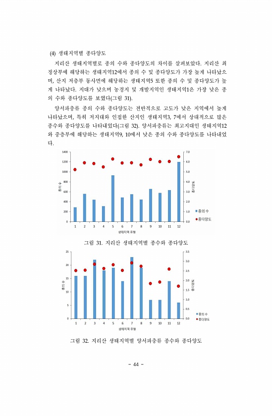 44 4 생태지역별 종다양도 지리산 생태지역별로 종의 수와 종다양도의 차이를 살펴보았다. 지리산 최 정상부에 해당하는 생태지역12에서 종의 수 및 종다양도가 가장 높게 나타났으 며, 산지 저층부 동사면에 해당하는 생태지역5 또한 종의 수 및 종다양도가 높 게 나타났다. 지대가 낮으며 농경지 및 개발지역인 생태지역1은 가장 낮은 종 의 수와 종다양도를 보였다 그림 31 양서파충류 종의 수와 종다양도는 전반적으로 고도가 낮은 지역에서 높게 나타났으며, 특히 저지대와 인접한 산지인 생태지역3, 7에서 상대적으로 많은 종수와 종다양도를 나타내었다 그림 32 양서파충류는 최고지대인 생태지역12 와 중층부에 해당하는 생태지역9, 10에서 낮은 종의 수와 종다양도를 나타내었 다. 그림 31. 지리산 생태지역별 종수와 종...